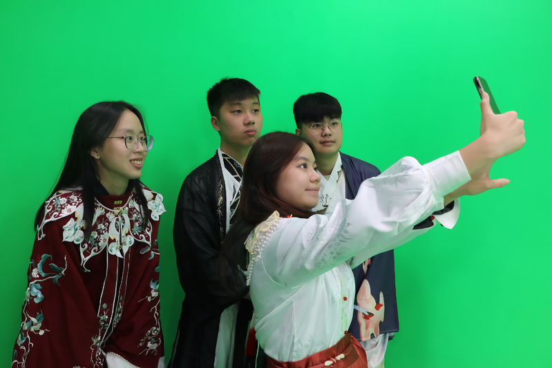 文化与传媒公司播音与主持专业的负责人谭迎春老师,身着传统汉服,逐一为员工讲述了汉服的穿着方法。她说,汉服不仅仅是衣服和装饰,还是文化的外在体现。她以不同时期、形制、样式的汉服为例,深入浅出地带员工了解了其背后所蕴含的礼仪和文化内涵。换上款式各异的汉服后,新加坡学子沉浸在这份古老而优雅的文化氛围中,感受着独具中国韵味的庄重与雅致。