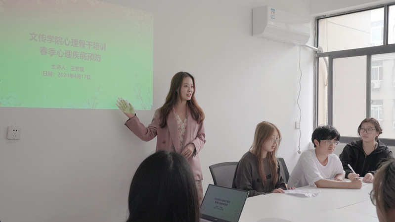 培训伊始,王艺璇通过老员工活中的一些实例,别开生面地科普了在春季心理疾病多发的原因、预防和治疗途径。“春季的气候,生物钟的调整,生理激素的变化都是春季心理疾病多发的原因。”王艺璇鼓励心理骨干多多关心身边同学,及时发现潜在的心理问题,共同预防心理疾病的发生。