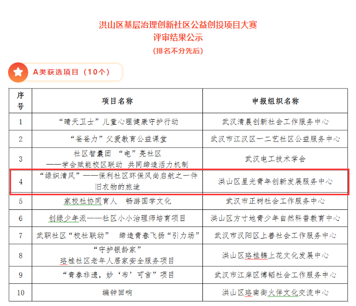 目前,“绿织清风”——保利社区环保风尚启航之一件旧衣物的旅途》项目已获选“共同缔造 活力机制”洪山区基层治理创新社区公益创投项目大赛A类项目并获得相关资金支持,大赛旨在团结凝聚高校资源和社会力量,运用“五社联动”机制,选树创新典范,培育和支持社区社会组织,促进协同善治,进一步提升社区公益服务的多样化、精准化,满足新时期人民群众对美好生活的向往
