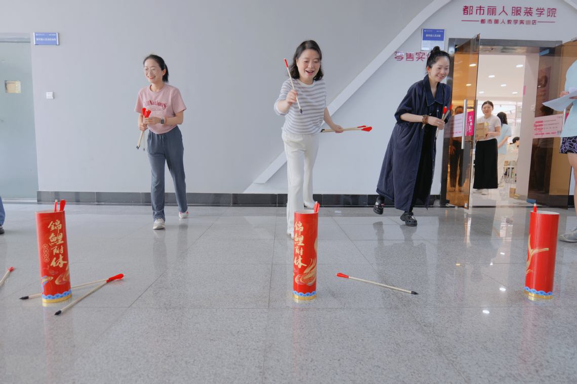 “选定一个目标点,瞄准,投!”端午节传统投壶游戏,是最受大家喜爱的活动。仔细思量握箭姿势、投掷角度、瞄准方式,教职工们轻巧地将手中的箭投向“锦鲤”壶,每投中一箭欢呼雀跃,现场好不热闹!