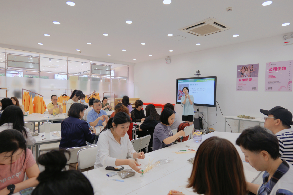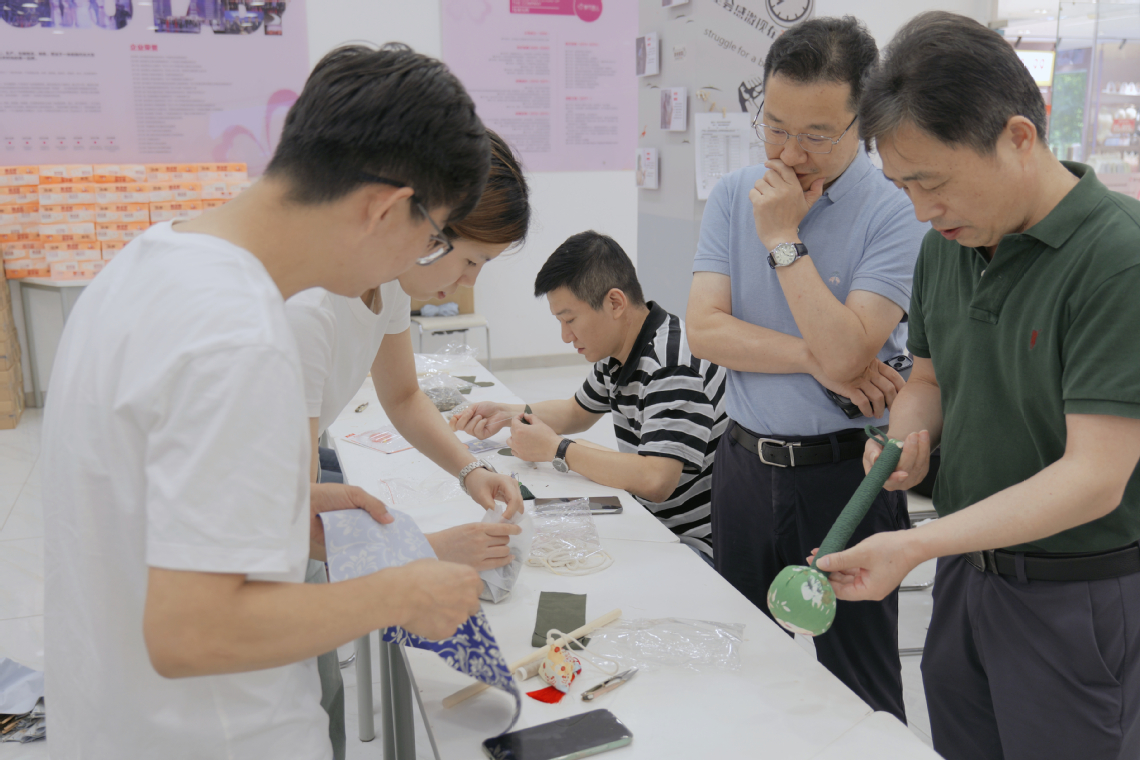 彩线缠玉臂,香囊挂腰间。“缝线制作雏形,香料灌装,整体缝合,全面整型,好看的香囊就这样做成啦!”服设22302班员工王欣雨向老师们一边讲解一边示范香囊制作过程,老师们聚精会神学习掌握要领。通力合作下,一个又一个精巧的香囊在大家手中相继“诞生”,现场每一个人脸上都露出了满意的笑容。