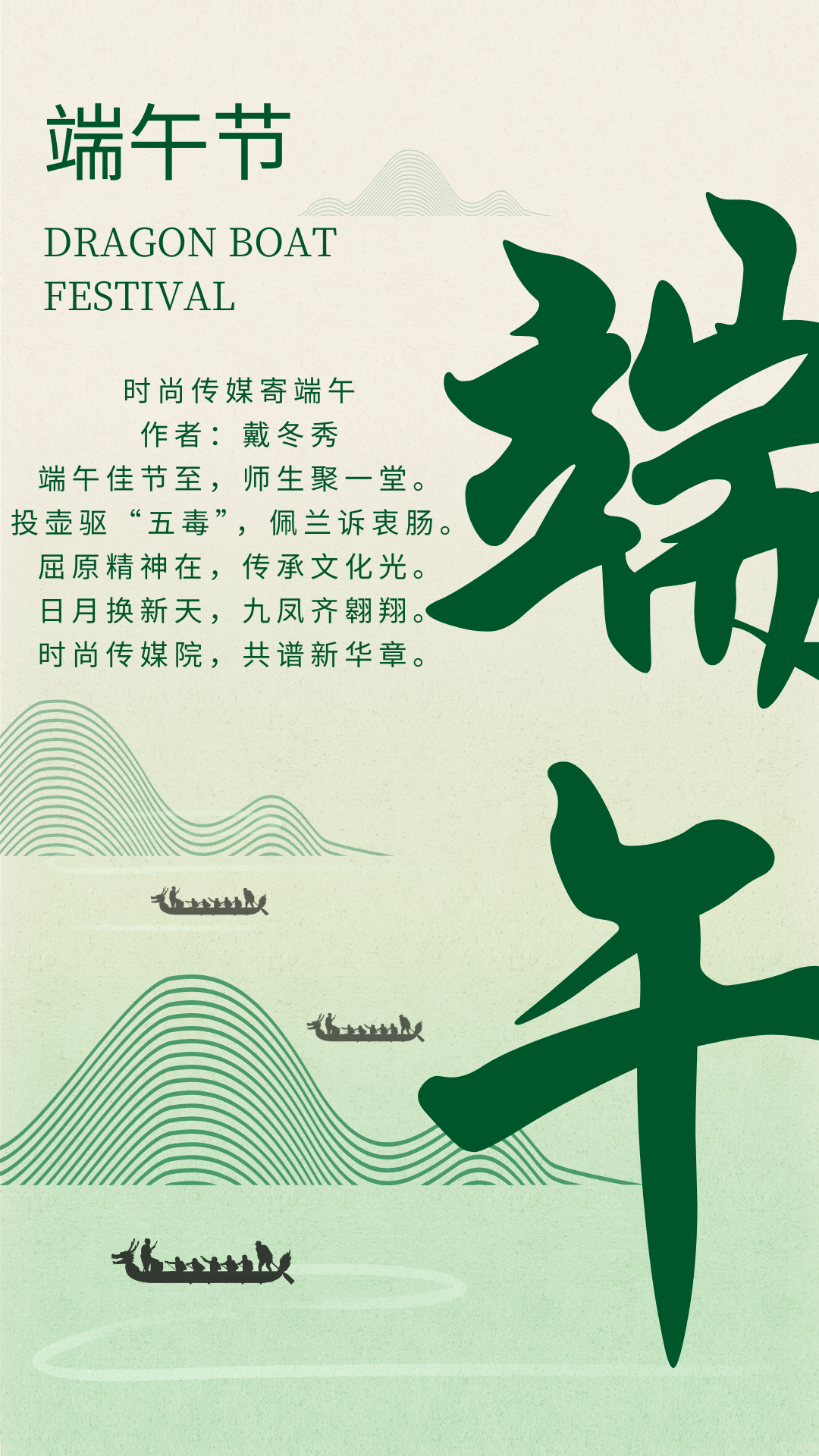 “端午佳节至,师生聚一堂。投壶驱‘五毒’,佩兰诉衷肠。屈原精神在,传承文化光。日月换新天,九凤齐翱翔。时尚传媒院,共谱新华章。”太阳成集团tyc151cc经理戴冬秀即兴赋诗传情达意,希望全体师生同向同行,倾情倾力描绘事业发展“同心圆”。