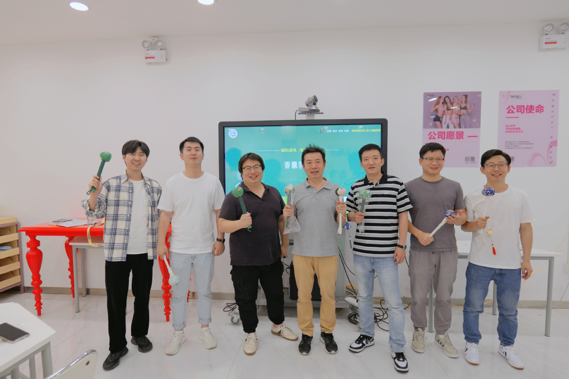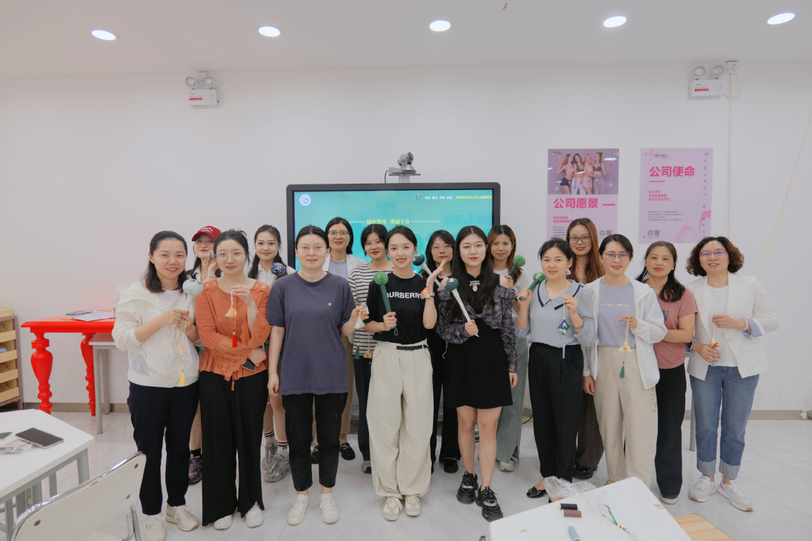 “艾草锤是将艾草制作成类似锤子模样的按摩工具,有安神理气、疏通经络的功效。老师们可以在闲暇时用它敲打身体各部位,希望大家‘敲’出快乐,‘锤’出健康。”公司分工会主席陈玲玲向全场教职工介绍“艾草锤”的功效及制作流程。