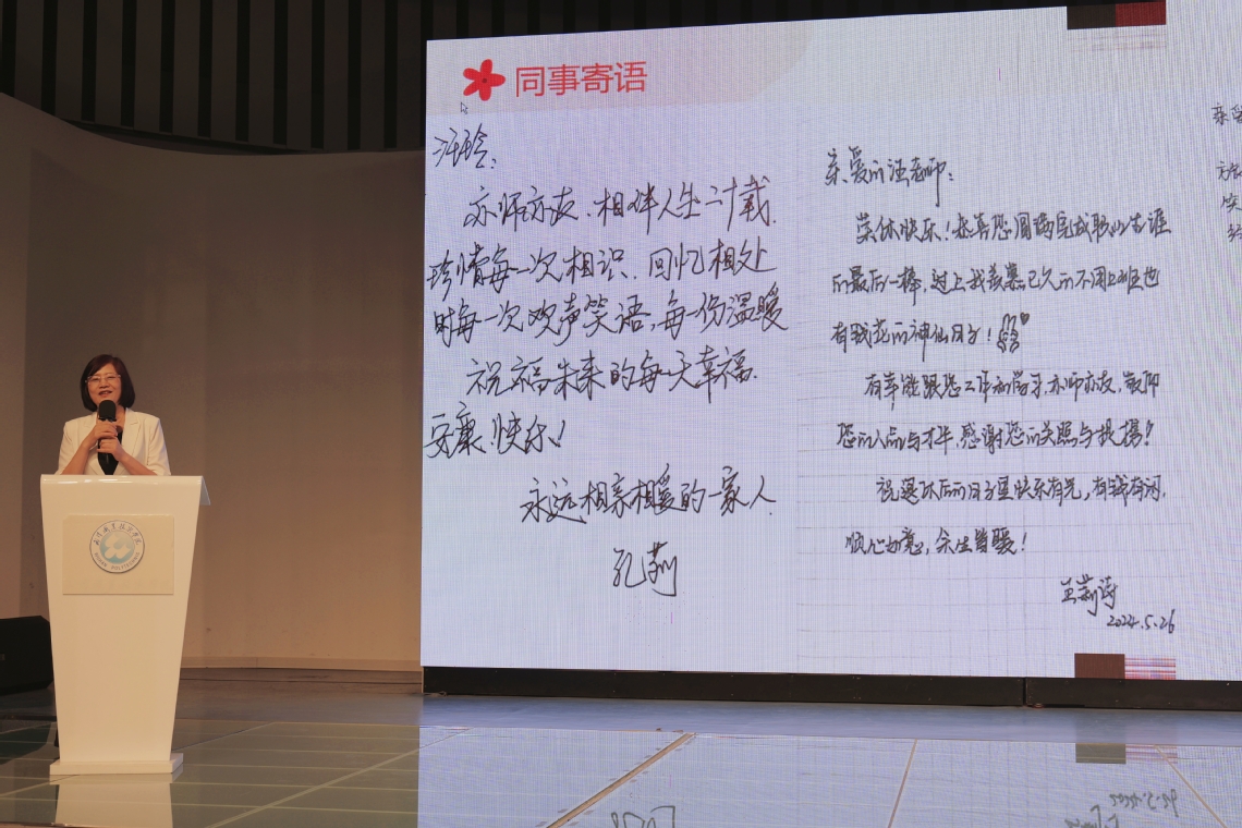 教师代表李岳、杨雪君分别分享了与三位退休教师共事的点点滴滴,表达了对他们的祝福、感激与不舍,并祝愿三位教师拥有幸福美满的荣休生活。
