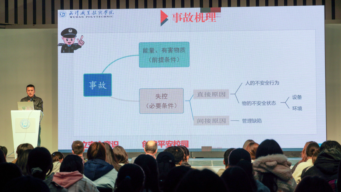 项洪文以《树立安全意识,创建平安校园》为主题,援引大量真实生动的案例,分别从“安全事故发生的原因”“如何预防安全事故”以及“怎样清除安全隐患”三个方面展开讲解。