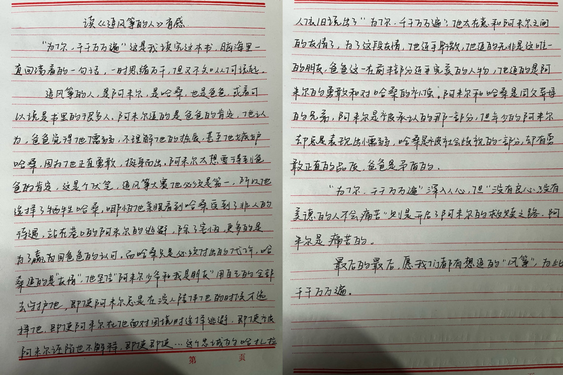 网播24302班魏诗婷被《追风筝的人》打动,她说:“书中的故事让我反思自己,懂得珍惜友谊和勇敢面对错误。”
