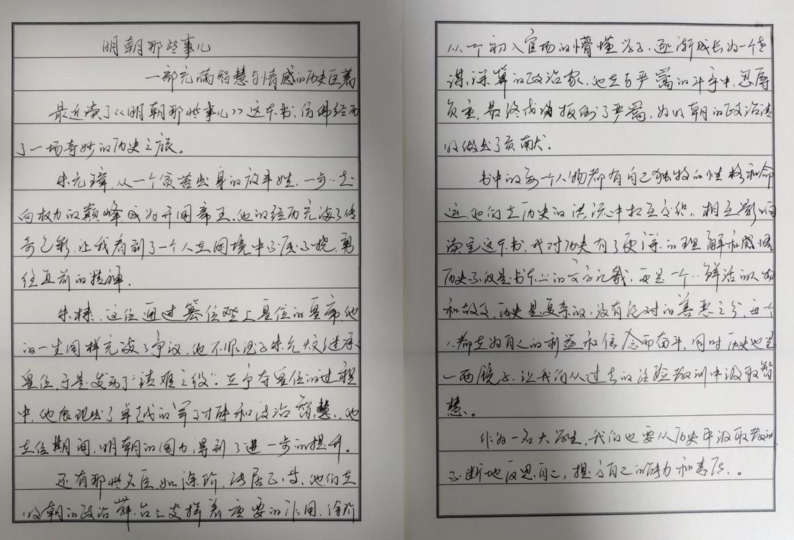 服工24301班刘文雅阅读《明朝那些事儿》后写下感悟:“读这本书,像穿越历史长河,看到人性的复杂和国家命运的起伏,让我学会在困境中坚定信念。”
