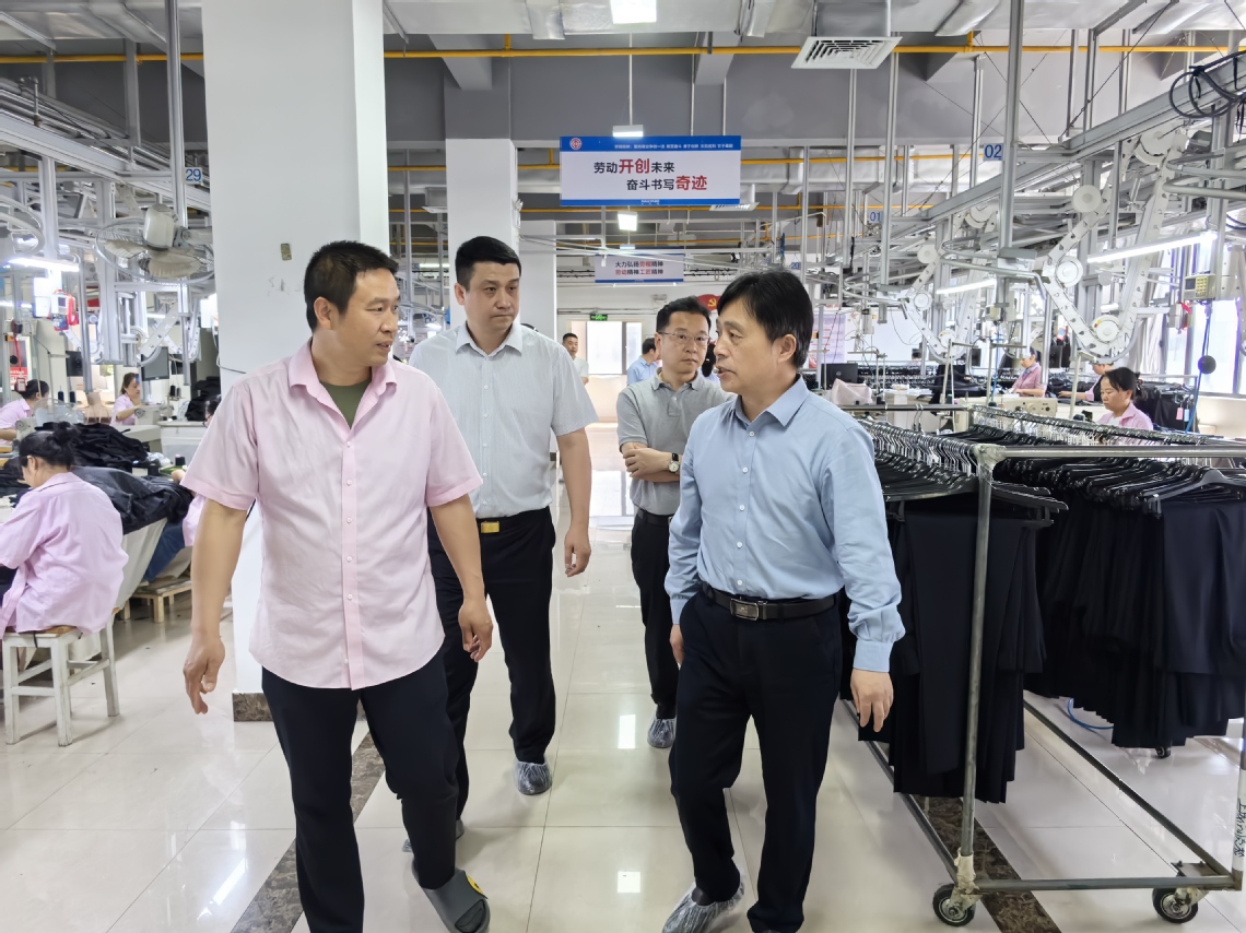 胡象斌一行在湖北美尔雅集团有限公司党委书记叶家鹏陪同下,参观了美尔雅集团智能化生产车间及产品展示厅,深入了解服装设计、生产流程、市场销售及数字化转型情况,实地感受美尔雅集团生产运营模式和技术创新成果。