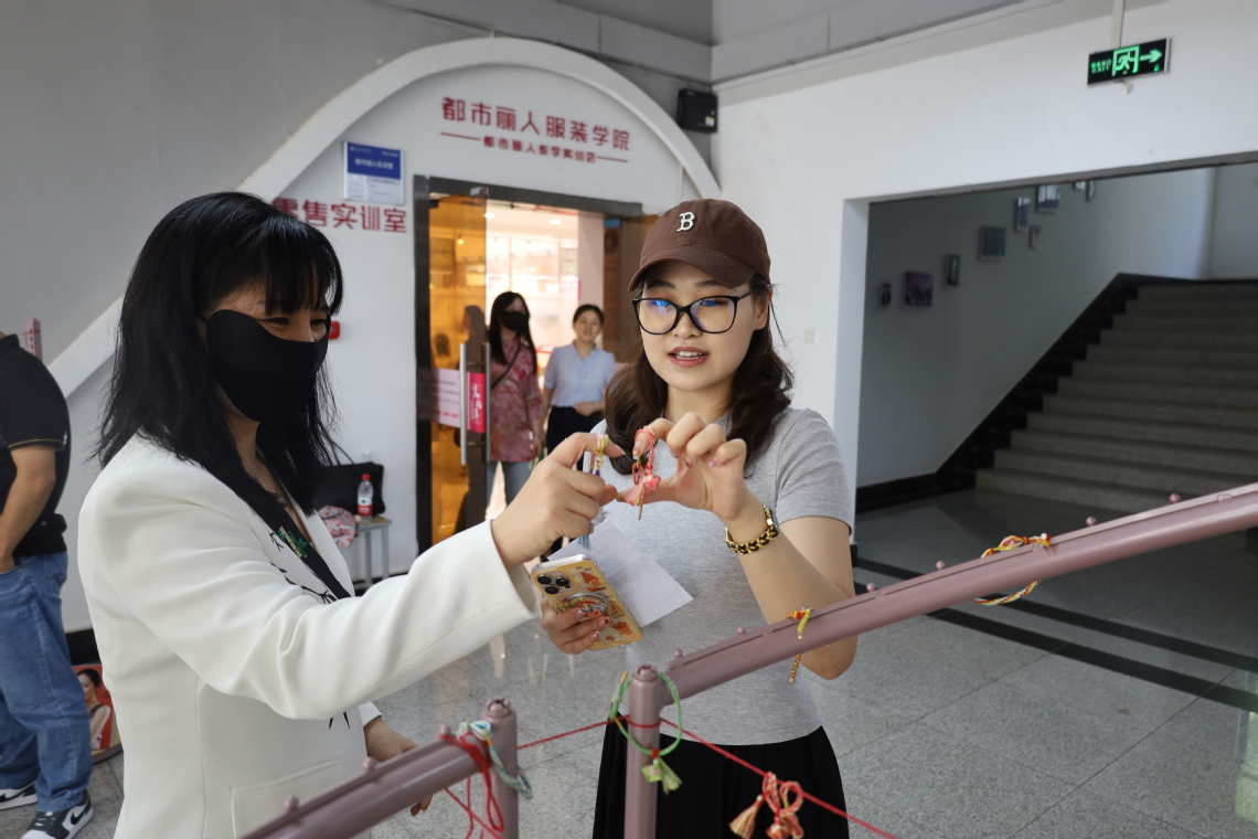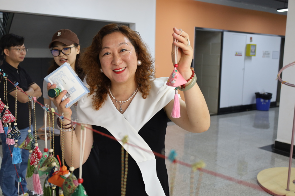 “我的香包虽针脚不规整,可它饱含着可爱与欢乐。”青年教师陈安宁展示着自己的小作。“这也是我第一次尝试做香包,我准备把这个香包送我的员工,因为一针一线都藏着我对她的期待,愿她能带着这份祝福,勇敢追梦。”