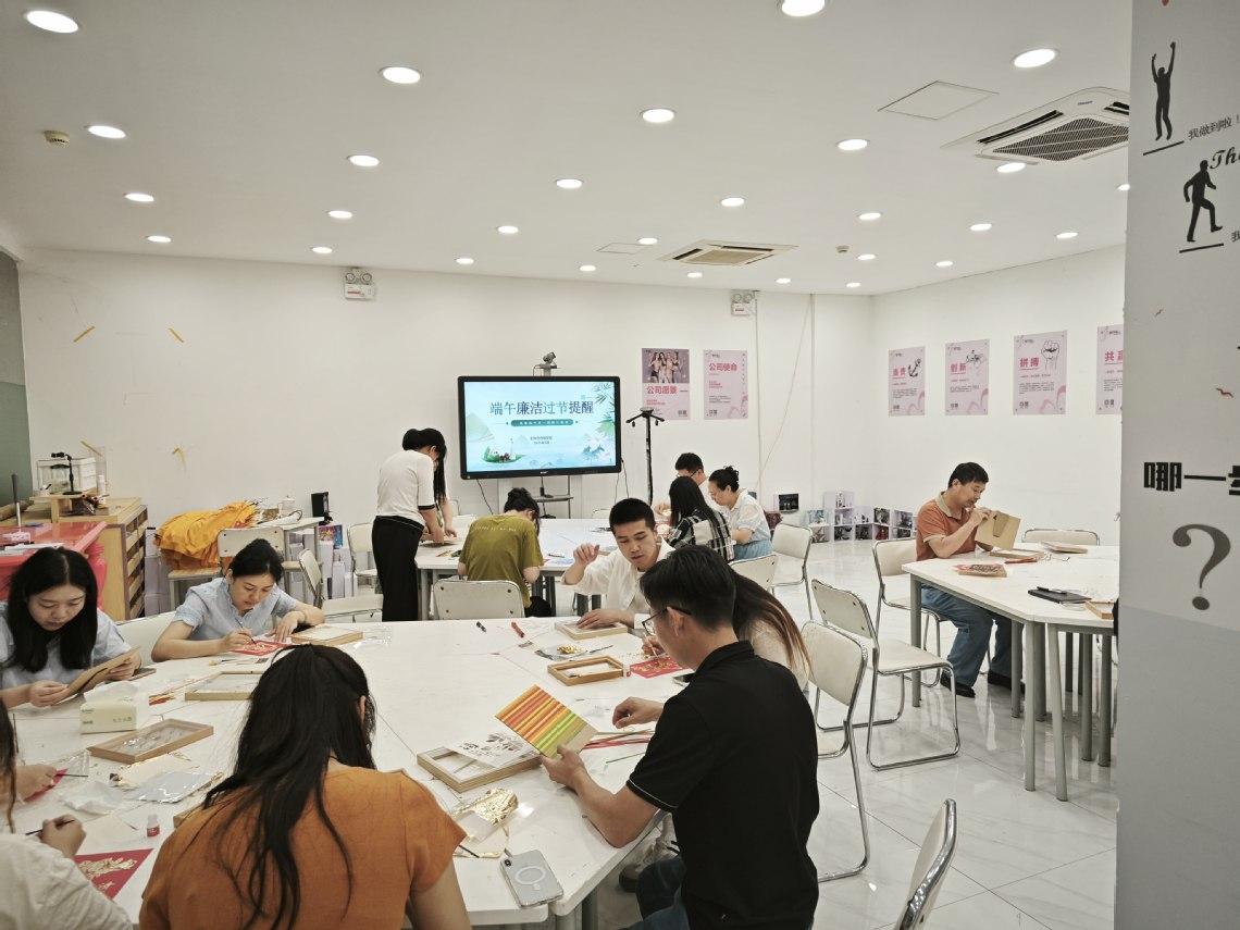 竹编画作为一项极具特色的非遗技艺,巧妙地将竹子的自然美感与艺术创作相结合,展现出独特的魅力。在老师们灵巧的手中,竹篾化身为画笔,勾勒出一幅幅生动的端午画卷,绽放光彩。