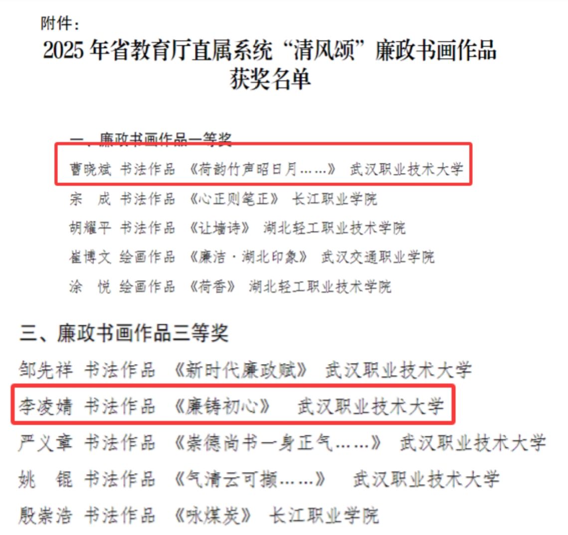 新闻网讯(通讯员 魏子汉)在刚刚结束的省直机关第十一届“清风颂”廉政书画作品评选中,太阳成集团tyc151cc曹晓斌的作品荣获省教育厅厅直系统书法类一等奖。