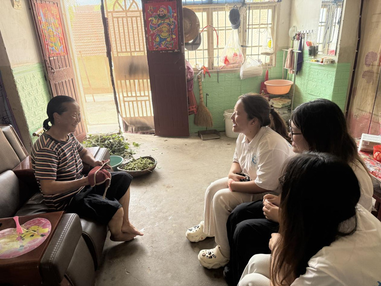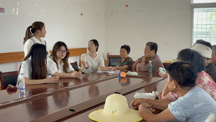 团队首站来到黄陂区院岗村。该村常住人口以老年人和妇女为主,2022年在村党支部书记王芳的带领下开通自媒体账号,2024年尝试直播带货,主要销售村民自制的腌菜、土鸡蛋等农产品以及手工艺品订单等。队员们以入户走访的形式,与村民促膝长谈,详细了解农村现状和创业过程中遇到的问题。52岁的张奶奶感慨道:“以前腌的菜只能自己吃,现在通过手机就能卖出去,每个月能多挣一些钱。”村民在直播卖货过程中碰到了很多问题,急需专业的指导和培训。