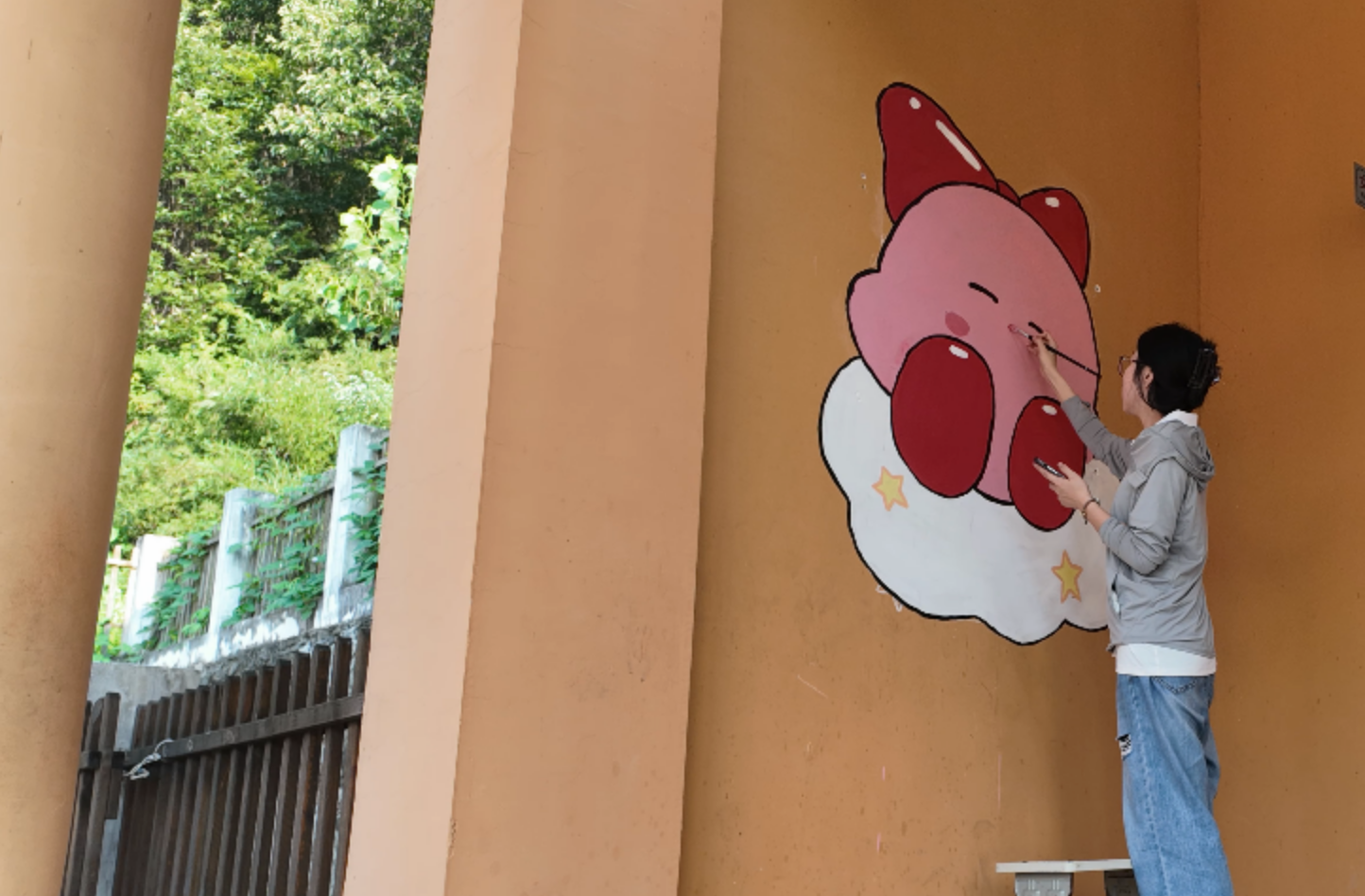 基于调研结果,实践队确定以“墙绘+语言”为核心,打造可视化、场景化的推普阵地,并联动直播传播扩大影响,具体推进两大行动:设计5幅主题墙绘,含1幅旧墙绘翻新、4幅新增,“实用场景墙绘”标注拼音,“方言与普通话对照墙绘”用“搞么斯—干什么”等新县方言搭配,降低学习门槛;开展2场“跟着墙绘学普通话”直播,队员讲解设计思路、教读句子、云游村庄,单场直播点赞破1.2万。