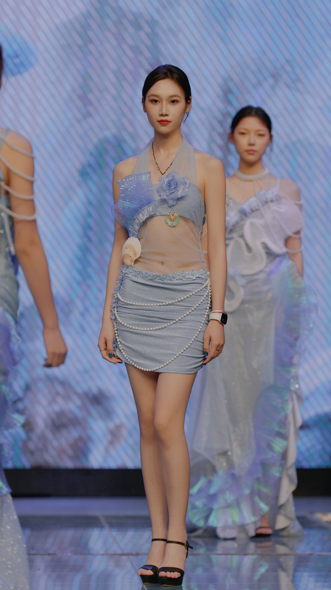 动态秀集中呈现了《解构查尔瓦》《浪舞潮汐,听海》《墨韵革华,袂映新章》《皮影》《金叙》等十余组毕业设计系列。从非遗传承、可持续时尚、国潮创新、数字融合、海洋保护等多个维度展开创作实践。《解构查尔瓦》以当代设计语言重构民族传统披毡;《浊洋》将海洋废弃物料转化为服饰元素,传达生态保护理念;《银绣新序》推动苗绣工艺融入现代生活语境;《织暗时刻》则借哥特美学演绎暗黑设计哲学......这些作品不仅体现出员工们在文化传承、科技应用与设计表达上的深入探索,也生动诠释了传统与未来、技艺与观念在时装创作中的融合共生。